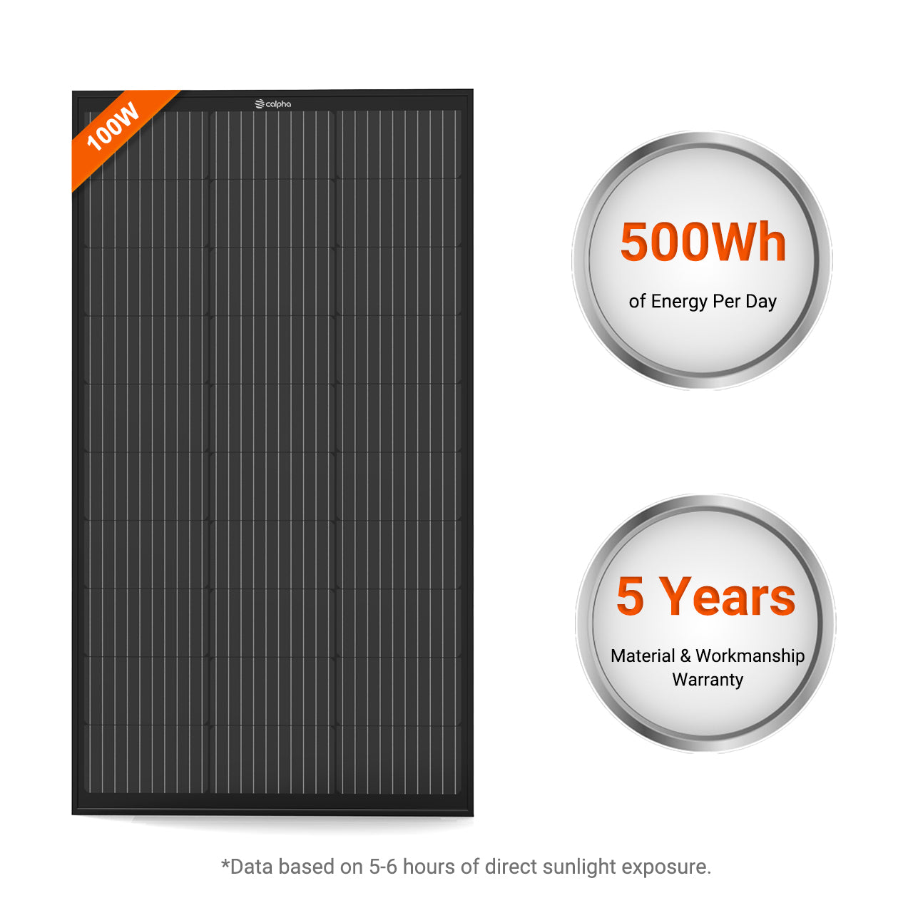 With an impressive monocrystalline conversion rate of 23% and backed by certifications like FCC, CE, and RoHS, Calpha’s 100W rigid solar panel is designed to maximize energy generation. In optimal conditions, this panel for home and rv can produce approximately 500 Watt-hours of electricity per day, assuming 5-6 hours of direct sunlight.